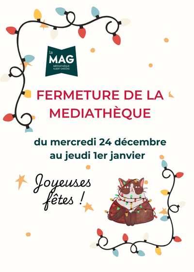 Thématique : CultureVotre médiathèque Albert Gardoni sera fermée pendant les fêtes du mercredi 24 décembre au jeudi 1er janvier inclus.