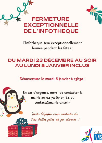 Thématique : InstitutionL'Infothèque sera fermée pendant les fêtes du mardi 23 décembre au soir au lundi 5 janvier inclus.