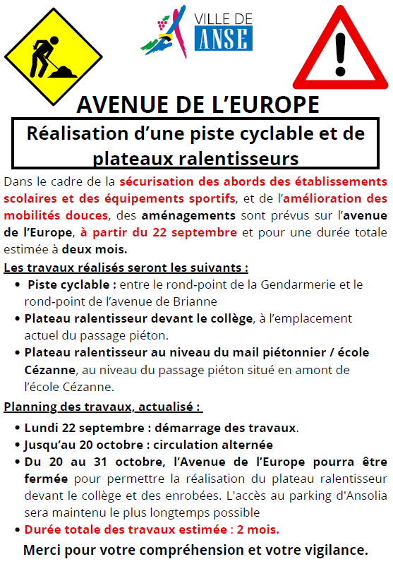 - Du 20 au 31 octobre, l'Avenue de l'Europe pourra être fermée pour permettre la réalisation du plateau ralentisseur et des enrobées. L'accès au parking d'Ansolia sera maintenu le plus longtemps possible.