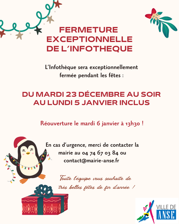 L'Infothèque sera fermée pendant les fêtes du mardi 23 décembre au soir au lundi 5 janvier inclus.
