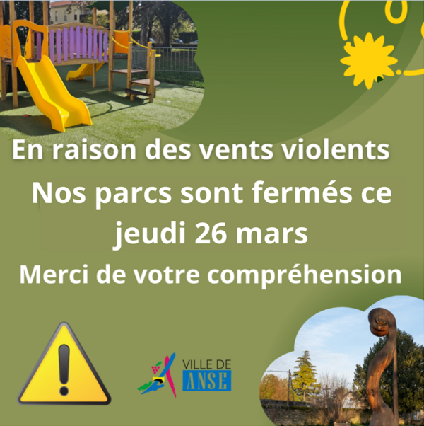 Pour votre sécurité, les parcs de Messimieux et de la Roseraie seront exceptionnellement fermés ce jeudi 26 mars, en raison des vents violents.