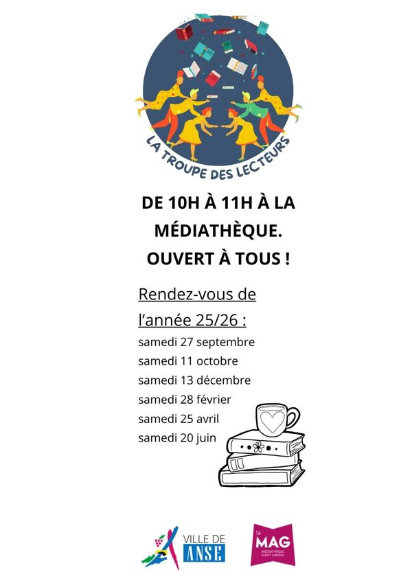 📚️ Retrouvons-nous de 10h à 11h, pour La Troupe des Lecteurs, le rendez-vous convivial idéal pour discuter, autour d'un café, de vos dernières lectures, aux dates suivantes :