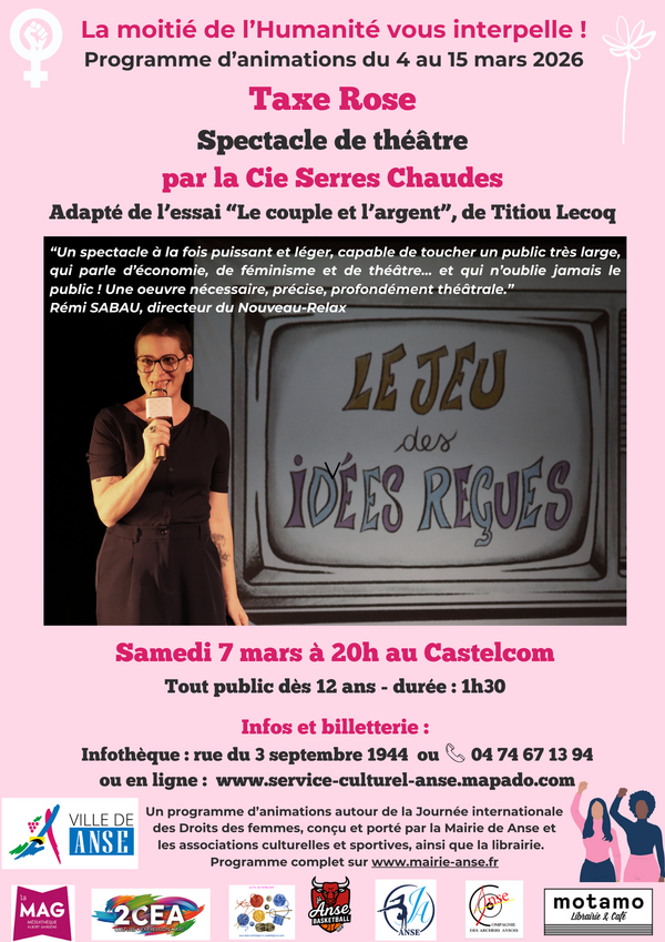 🪭 Un spectacle organisé dans le cadre du programme d'animations "La Moitié de l'Humanité vous interpelle!" : Un programme d’animations autour de la Journée internationale des Droits des femmes, conçu et porté par la Mairie de Anse et les associations culturelles et sportives, ainsi que la librairie. Programme complet sur www.mairie-anse.fr