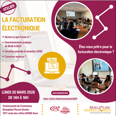 Un atelier de facturation électronique vous est proposé par la Communauté de Communes Beaujolais Pierres Dorées et animé par la Chambre de Métiers et de l'Artisanat.